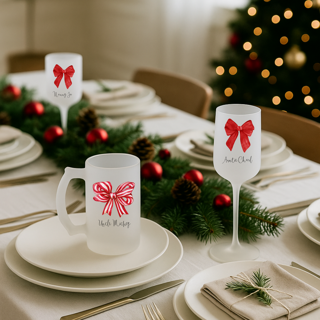 personalised Christmas glass, bow wine glass, bow beer glass, matching family glasses, custom Christmas drinksware, festive wine glass, festive beer glass, personalised holiday gift, family Xmas gift, Christmas party glasses, unique Xmas glassware, custom name glass, Christmas gift for family
