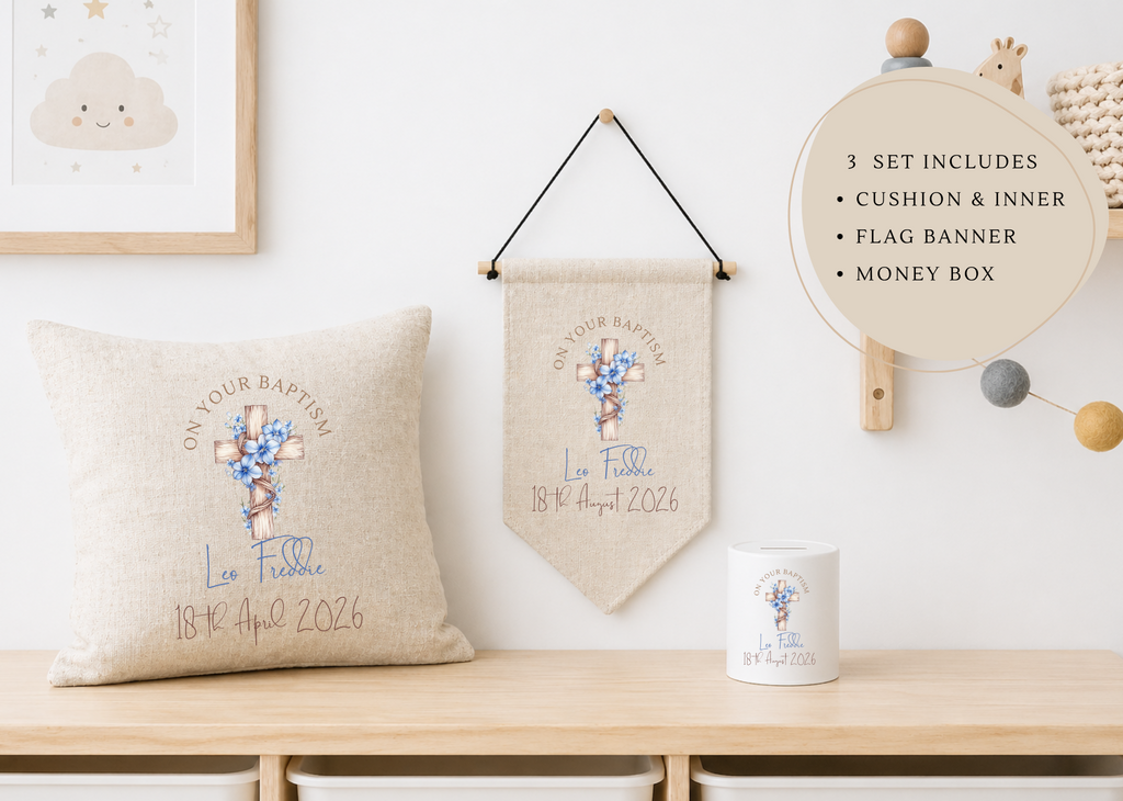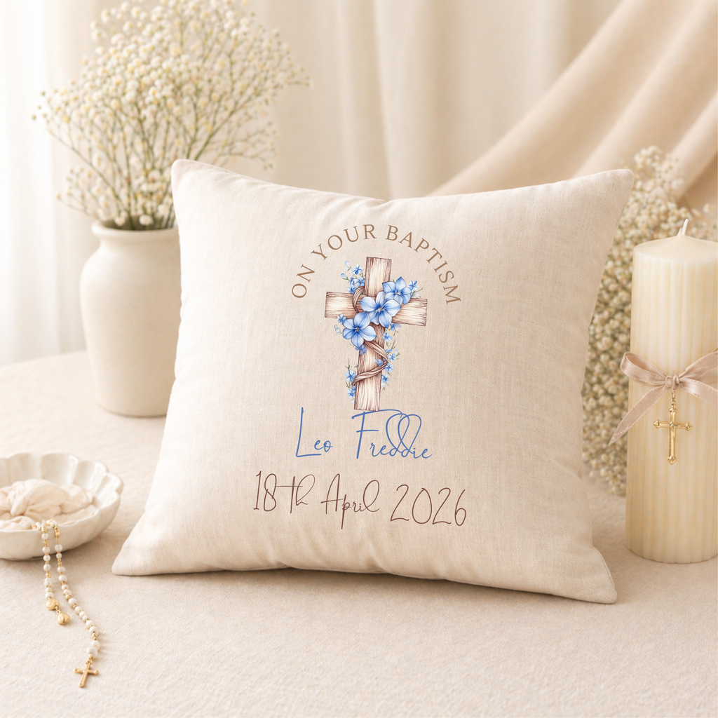 Celebrate one of life's most precious milestones with a gift that is as special as the day itself. Our Personalised Cushion features a stunning cross design, customised with your chosen name, date, or message, making it a truly unique and heartfelt keepsake that will be loved for years to come.
